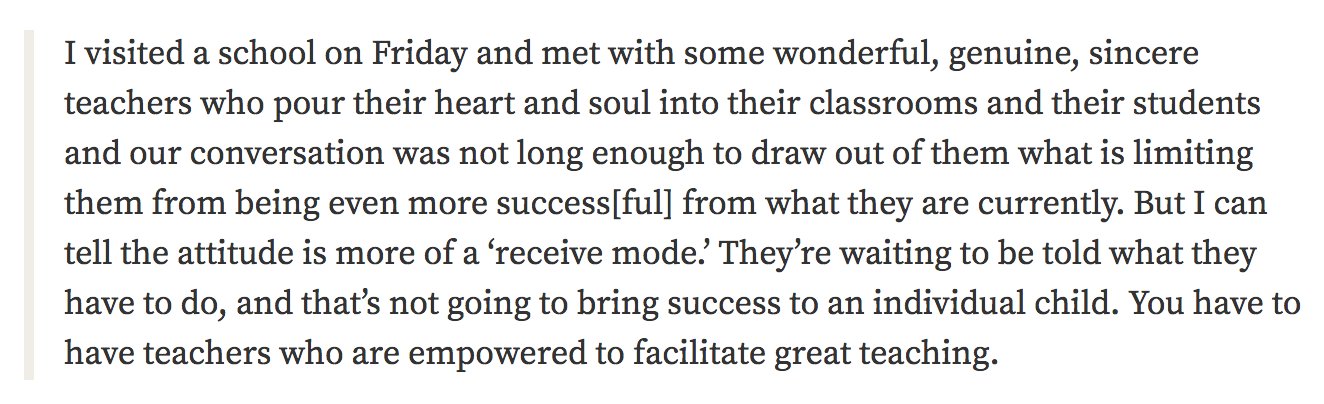 That is what Betsy DeVos, member of the AMWAY family of billionaires, and our new Secretary of Education, had to say a few days ago after visiting a DC middle school. This is from someone who never taught anything to anyone-ever! "They're waiting to be told what they have to do...". Really? Go on twitter and read the teachers' and administrators' responses.